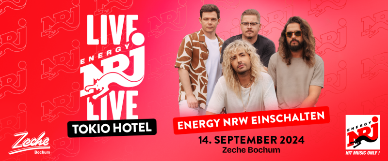 ENERGY LIVE, die europaweit bekannte Konzertreihe der ENERGY/NRJ-Gruppe, mit TOKIO HOTEL findet am 14. September in der Zeche in Bochum statt.